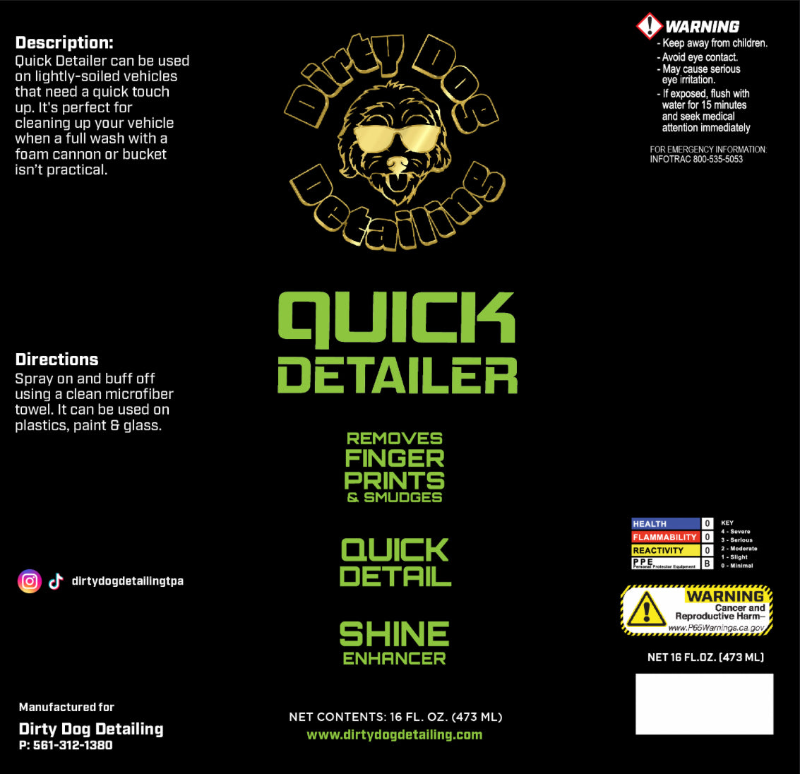 The quick detailer/rinseless wash is formulated with surfactants and silicones to provide both light shine and cleaning properties. It can be used to touch up your vehicle at a car show, as a clay bar lubricant or as a rinseless wash for a vehicle that is mildly dirty. It is ready to use in a 16 oz spray bottle.